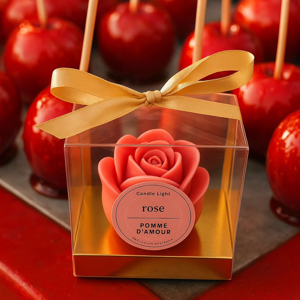 Notre bougie en forme de rose dévoile un parfum exquis de Pomme d'Amour qui évoque instantanément des souvenirs d'enfance. Élaborée avec un parfum raffiné de Grasse, sans substances CMR, elle allie plaisir olfactif et sécurité. Sa cire de colza 100% végétale témoigne de notre engagement écologique. Chaque création artisanale est présentée dans un écrin élégant, faisant de cette bougie un cadeau aussi distingué qu'original pour toute occasion.