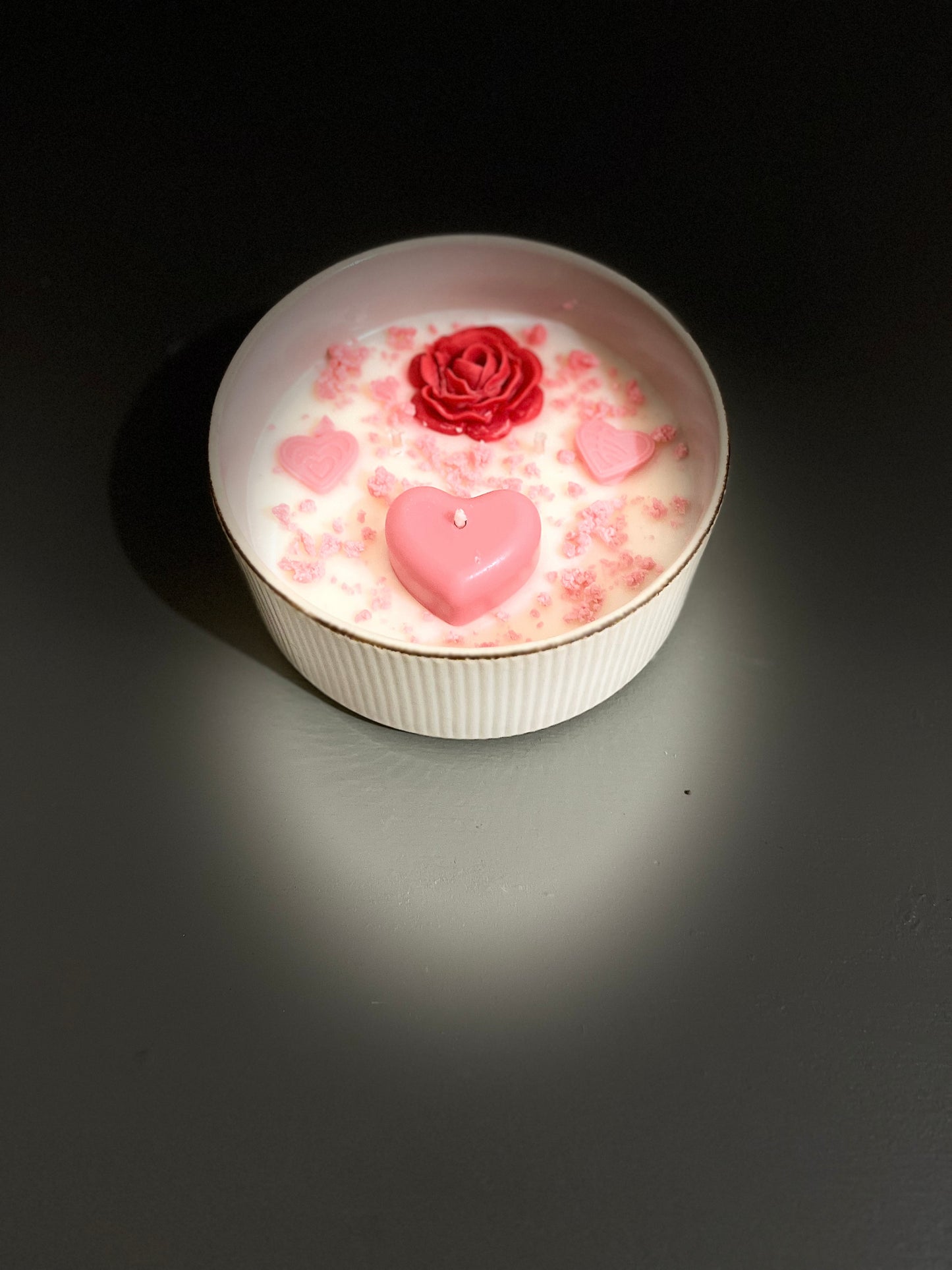 Offrez-vous un moment romantique avec notre magnifique pot blanc de 270 gr, décoré de coeurs et d'une fleur. Son doux parfum Kiss-Kiss / Rose d'Amour vous envoûtera pour une ambiance passionnée et luxueuse. Idéal pour une touche de sophistication dans votre espace de vie.
