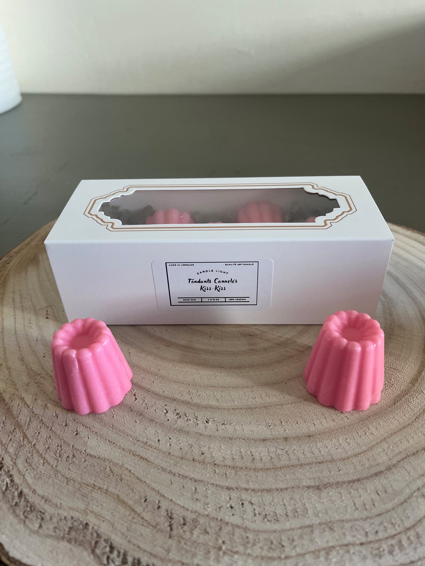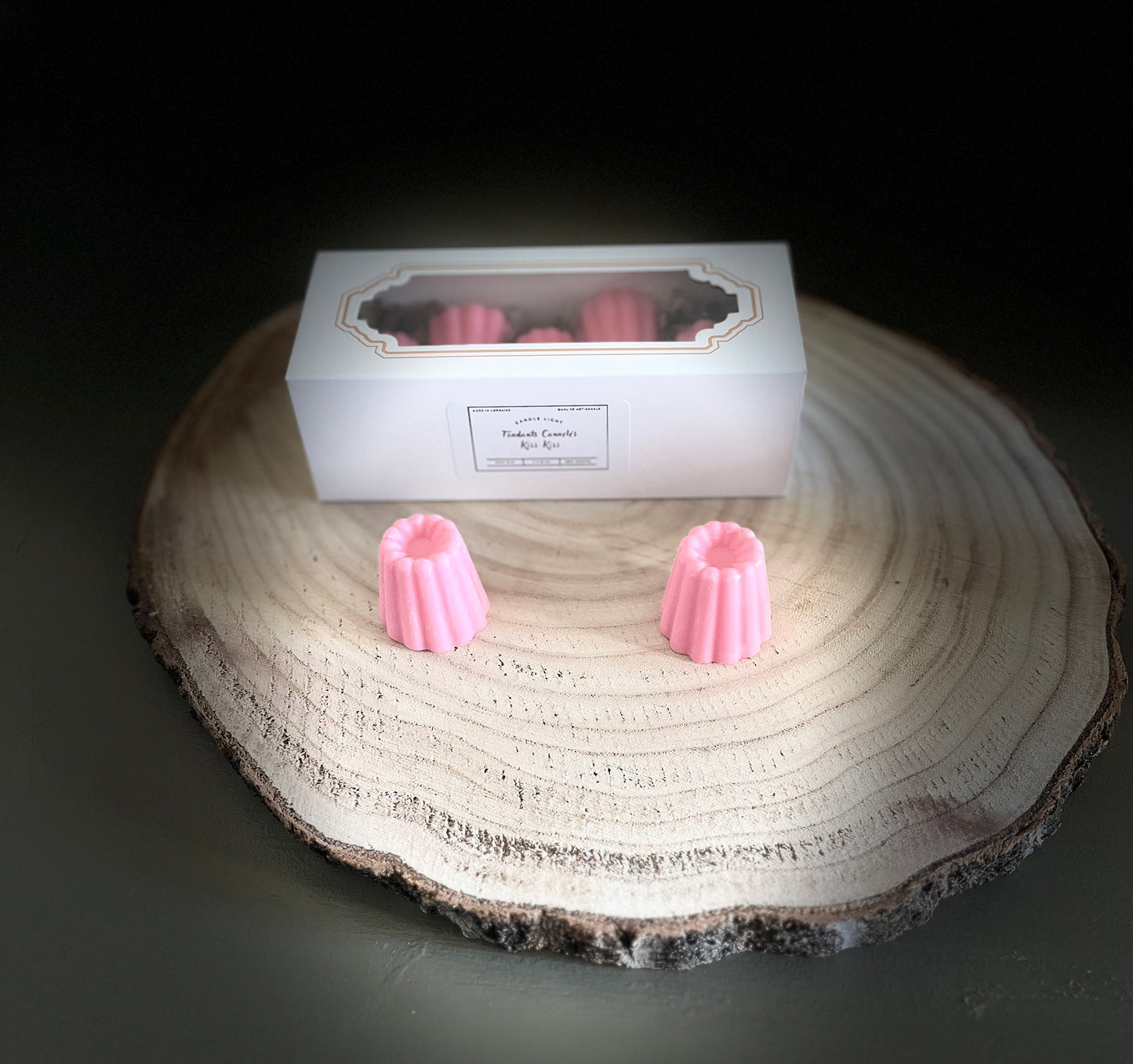 Célébrez l'amour et la tendresse avec les fondants parfumés en forme de cannelés Kiss-Kiss, présentés dans une boite élégante de 5 fondants ( 95 g environ ).
